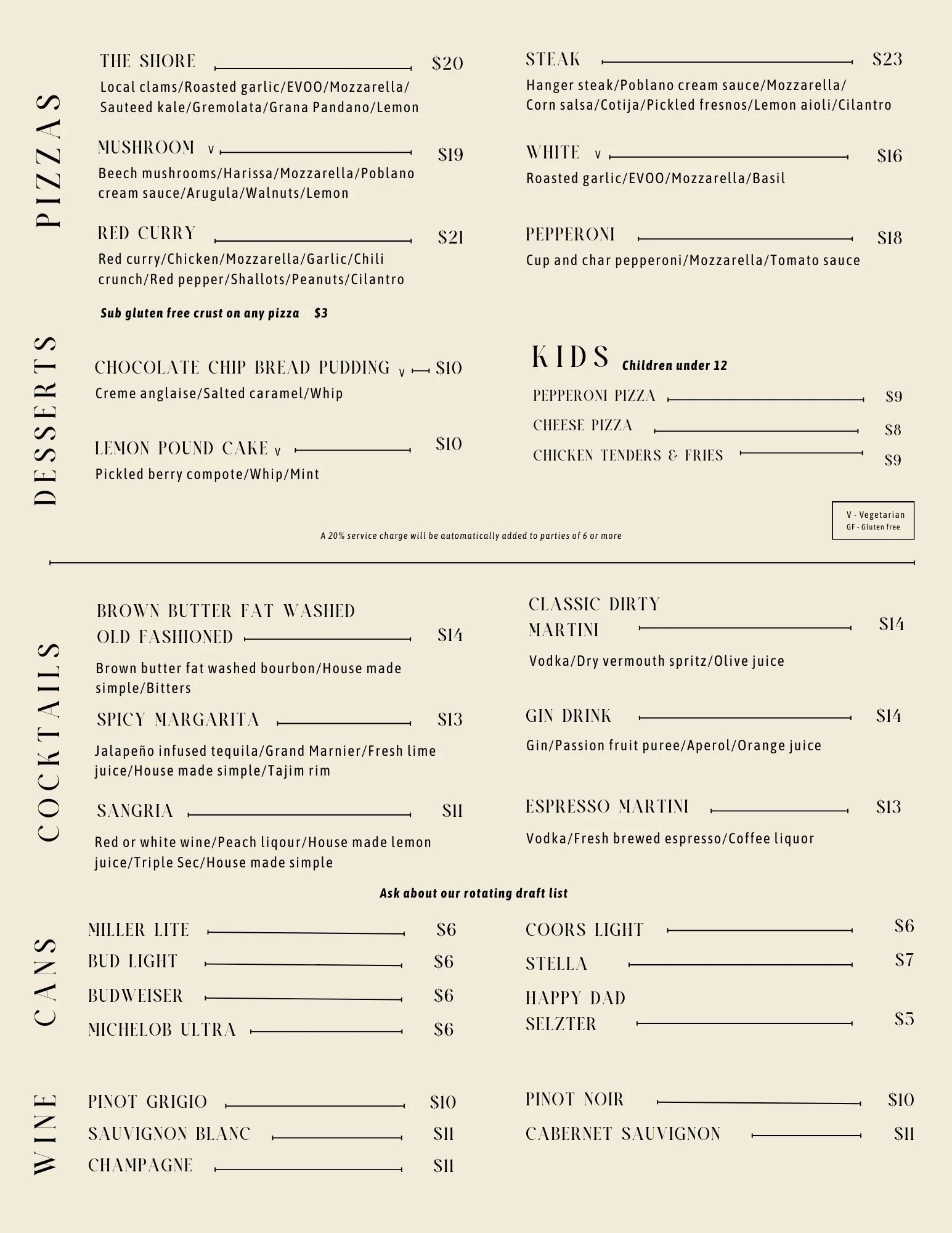 We make fresh pasta, offer gluten-free options, and serve complimentary garlic rolls with every main — because details matter. Our craft cocktail program features house infusions, brown butter fat-washed bourbon, and modern twists on classics alongside a curated wine list and rotating drafts.